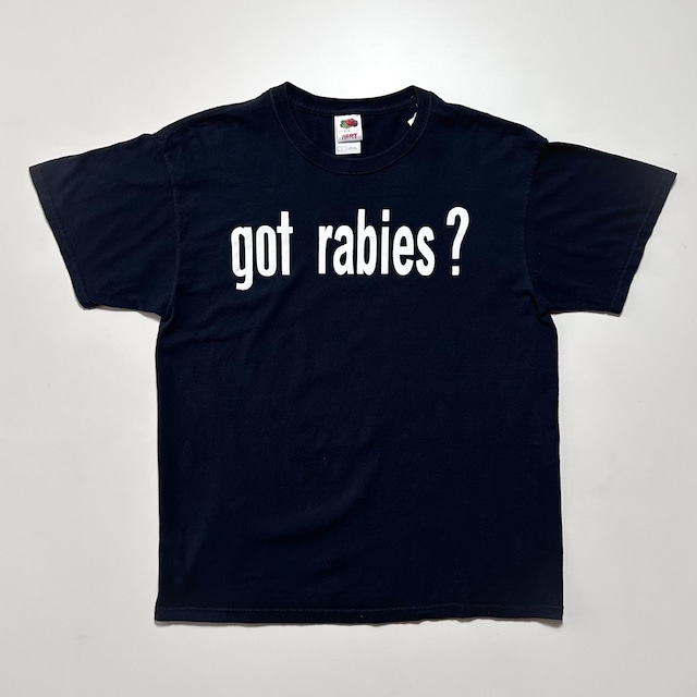 got rabies? (狂犬病足りてる?) 足りていいわけがない1枚。 アメリカの中で最も成功したキャンペーン広告の一つGOT MILK?のパロディです。 シンプルな文字列が着回しやすいアイテムかと。 表記 【L】 肩幅 54cm 身幅 56cm 袖丈 18cm 着丈 70cm 【コンディション】 特筆するようなダメージなし ※購入確定前にページトップの【ご利用前にご一読ください】を必ずお読みください。
